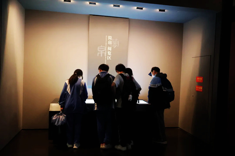 大巴車在歡歌笑語中一路奔馳,于上午9點抵達省博物館。同學們在老師和研學導師們的指揮與組織下有序地排隊入館,隨后便依據各自興趣,分別去往不同的展廳進行參觀。其中,同學們最感興趣的,莫過于位于三樓的“馬王堆漢墓陳列”展廳。走入展廳,光線立即黯淡下來,映入眼簾的古銅色浮雕古樸莊重,令游覽者恍然穿越千年,仿佛置身西漢時期的古長沙國。